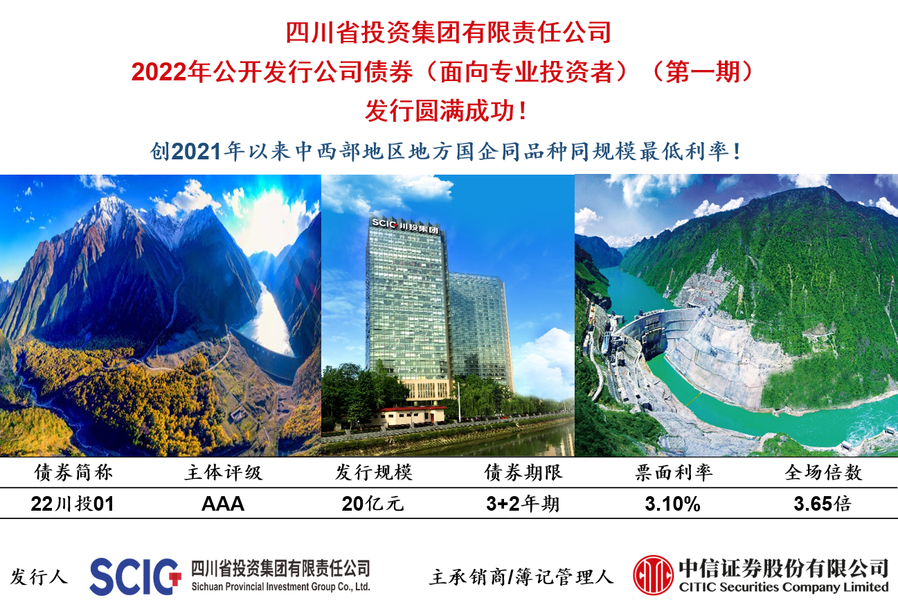 4月6日,川投集团2022年公司债券(面向合格投资者)(第一期)在上海证券交易所成功发行。本期公司债券发行规模20亿元,债券期限3 2年,发行票面利率3.10%,低于央行长期限LPR定价150个BP,创2021年以来中西部地区地方国企同品种同规模最低利率,同时创川投集团有史以来中长期债券利率新低,债券存续期间可累计为企业节省利息支出约15,000万元。
