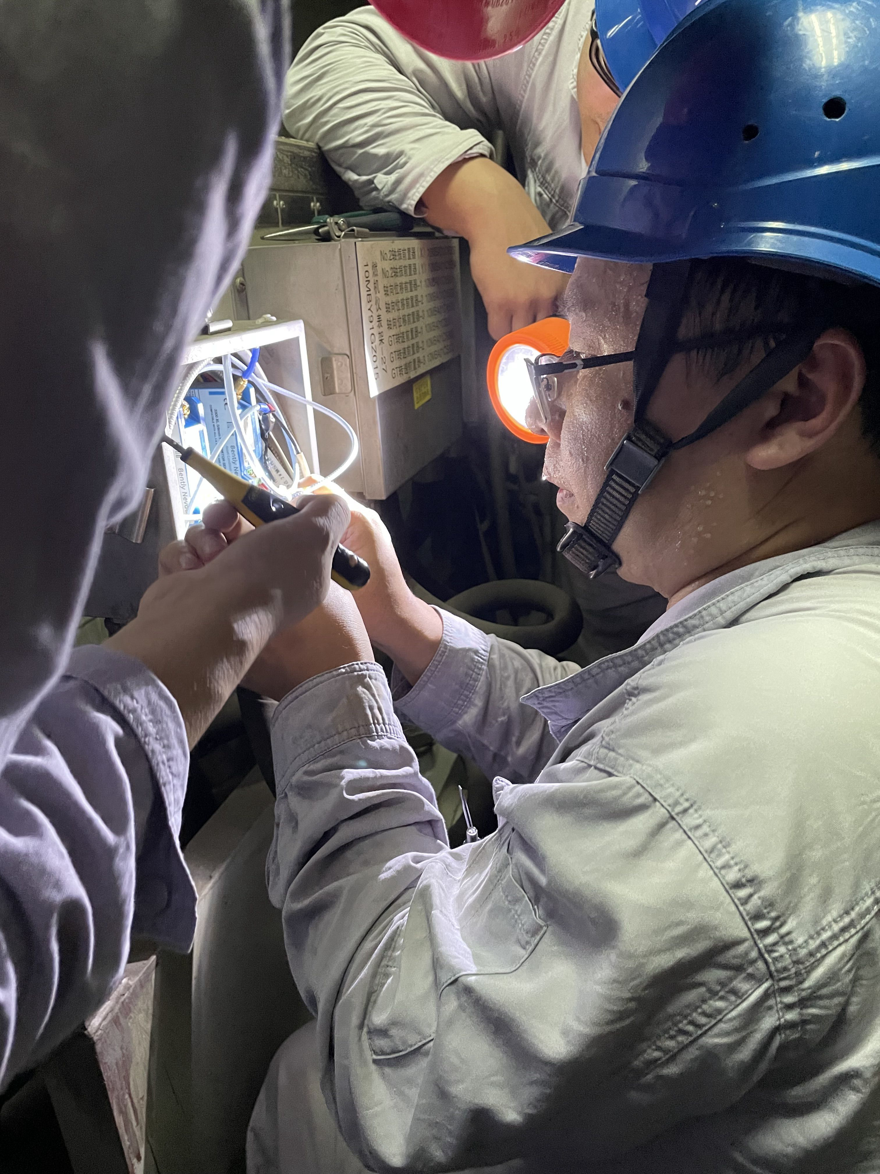 此时刚停运的燃机罩壳内温度高达60℃,如同一个巨大的“汗蒸房”。为了尽快抢修,薛国和值班人员祝青海、叶亭压根儿没时间等热气散去就开始了检查。