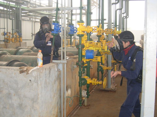 12月17日上午10点,一股白烟从新光硅业公司液氯库袅袅飘出,刺鼻的感觉让巡检员惊呆:“不好了,液氯泄露了”!“报告屈段长,液氯库发生液氯泄漏,请指示”,“请不要慌张,请按照《液氯泄漏应急预案》迅速处置”!于是,巡检人员立即穿上防护服,戴上防毒面具冲入现场,有的拧紧阀门,有的向泄漏处洒水,有的疏散人群和抢救受伤人员…….大家慌而不乱,井井有条。不到一分钟时间,一场惊心动魄的“液氯泄露事故”得到有效处置。“报告李总指挥,演练完毕,请指示!”。原来这是新光硅业公司一号厂房合成工段在搞安全演练。