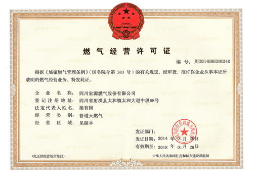 2013年11月18日,公司逐级向县住建局和市住建局提交了网上申请资料和相关材料。经过层层审核,12月底将申请资料和材料报送到省行政服务中心住建窗口,经省住建厅复核审批,2014年1月6日进行了为期10天的网上公示。1月26日通过网上通告,1月29日取得《燃气经营许可》,成为全省第一家取得燃气经营许可的企业。