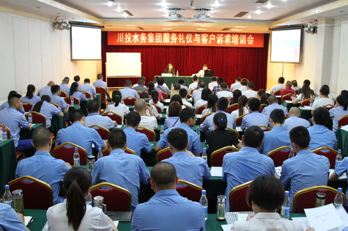 川投水务总经理助理何晓苏主持会议并指出,为进一步加强各所属公司客户服务工作,规范服务流程,妥善处理客户诉求,提升优质服务水平,树立川投水务形象,公司组织了这次服务礼仪与客户诉求培训会,特意邀请到成都燃气客户服务公司两位老师为大家讲解授课。