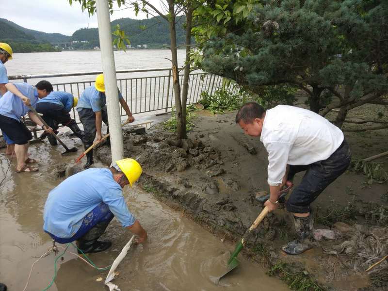 7月12日清晨6时许,涪江特大洪水水位逐渐褪去,射洪水司迅速对广兴龙滩取水口进行灾后抢险和清污工作,首先清理出视频监控室,开辟临时安全区。随后调配川投水务所属射洪水司、宏源气司员工组成应急抢险队,对取水泵房和关键通道口进行清污。梁有国董事长现场组织两家公司负责人制定抢险救灾方案,并挽起裤管,穿上雨靴,拿起铁锹,与抢险队员们一道,投入到紧张有序的抢险清污工作。