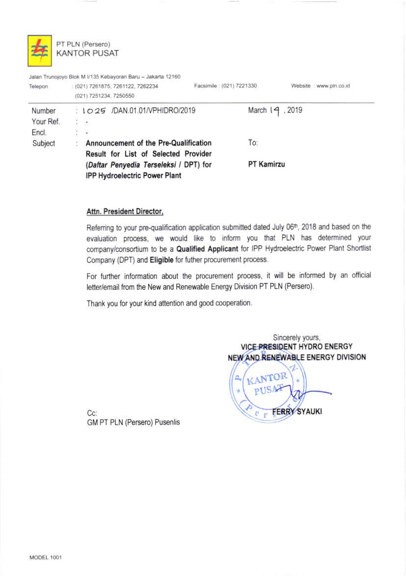 2019年3月14日,印尼国家电力公司(PT PLN)正式向印尼泰普1水电站(Tampur 1)项目公司(PT Kamirzu)颁发项目入选函。该入选函的获得标志着印尼泰普1(Tampur 1)水电项目正式列入印尼政府电力开发计划,具备全面开发的必要条件。