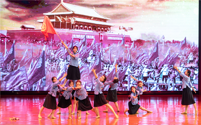 晚会分为青春心向党、学院展风采、礼赞新时代三个部分,包含歌舞、合唱、朗诵等总共11个节目。在炫目的灯光中,节奏动感的音乐响起,老师和学生踩着强有力的节拍跳起了炫酷的舞蹈,展现出学院师生“新时代、新文艺、新青年”朝气蓬勃的风采。
