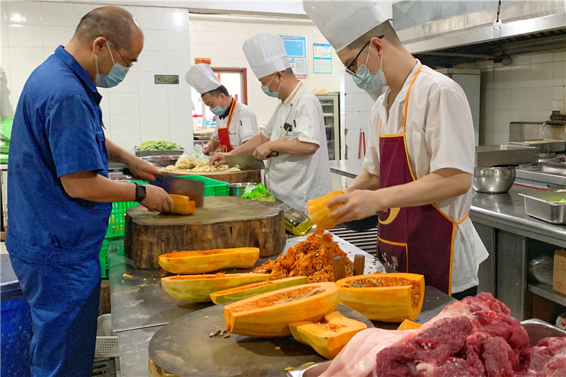 早上七点半,志愿者们已经在职工食堂备餐,他们整理新鲜的蔬菜、清洗蔬菜、给南瓜削皮,有厨艺负责切菜,大家合理分工、高效协作,个个充满干劲,每天早上7:30开始直到10:00左右。9月12日,志愿者们还一起为公司全体职工包了饺子,许多职工群众也自发的来到职工食堂帮忙。