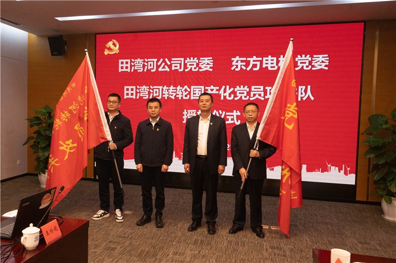 到达活动现场后,公司一行首先参观了东方电机重跨厂房、东电印记文化墙、数字化车间、水力试验台,了解了东方电机的基础生产情况和转轮国产化科研、生产进度。随后,双方进行了座谈交流。座谈中,双方党委委员共同领学了习近平总书记《高举中国特色社会主义伟大旗帜为全面建设社会主义现代会国家而团结奋斗——在中国共产党第二十次全国代表大会上的报告》;双方党委、基层党组织代表分享了党的二十大精神学习心得;对“转轮国产化”项目进展情况及下阶段工作的开展情况进行了交流,并举行了“田湾河转轮国产化党员攻关队”成立授旗仪式。