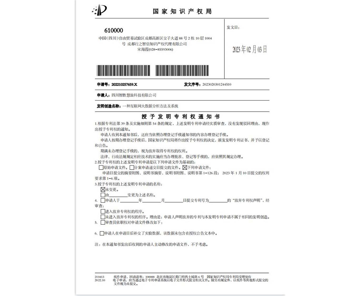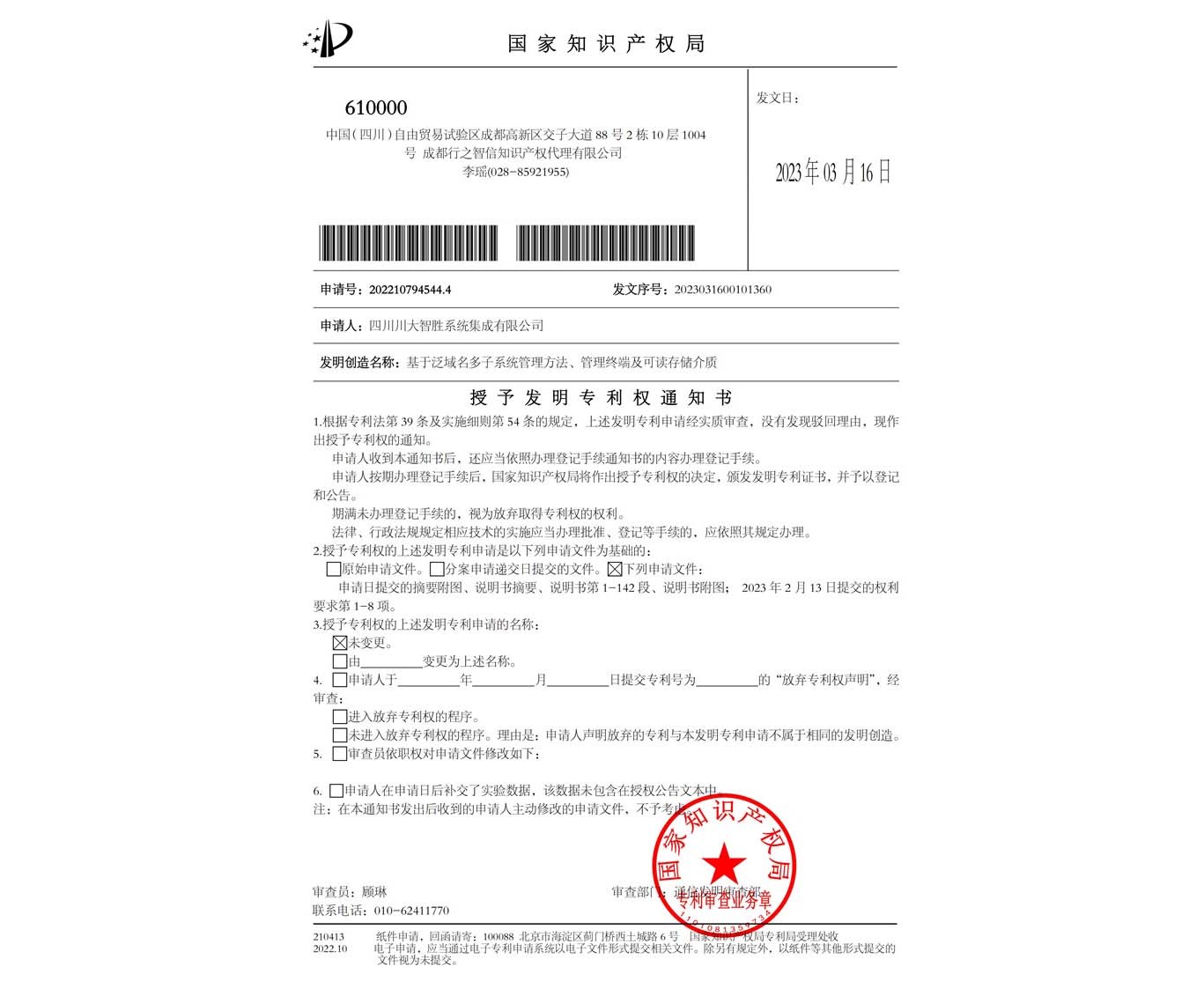 近日,川投信产所属智胜集成收到来自国家知识产权局的两份发明专利授权通知,两项技术分别为“基于泛域名多子系统管理方法、管理终端及可读存储介质”和“一种互联网大数据分析方法及系统”。
