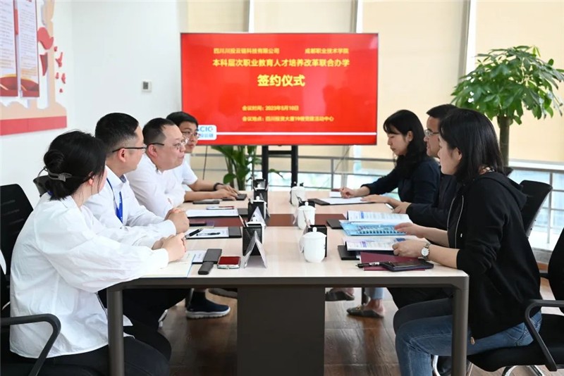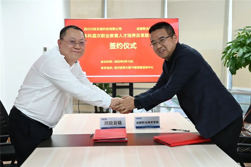 5月10日,川投信产所属四川川投云链科技有限公司与成都职业技术学院(以下简称“成职院”)校企合作签约仪式在川投云链成功举办。成职院财经学院副院长徐勇(主持工作)、川投云链总经理封飞等出席签约仪式。至此,成都大学、成职院与川投云链三方正式开启了校企协同育人新篇章。