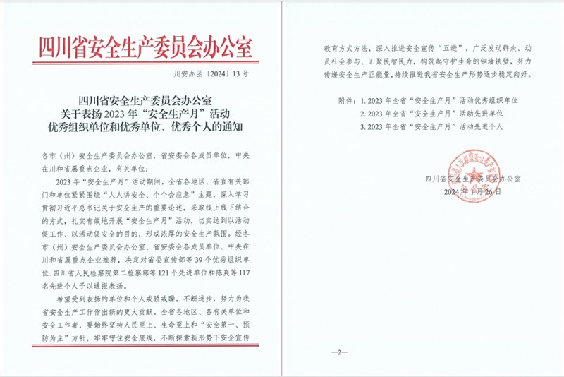 近日,四川省安全生产委员会办公室印发了《关于表扬 2023年“安全生产月”活动优秀组织单位和优秀单位、优秀个人的通知》,公司获得了2023年“安全生产月”活动优秀单位表扬,安全健康环保监察部负责人赵清俊获得了2023年“安全生产月”活动优秀个人的荣誉称号。
