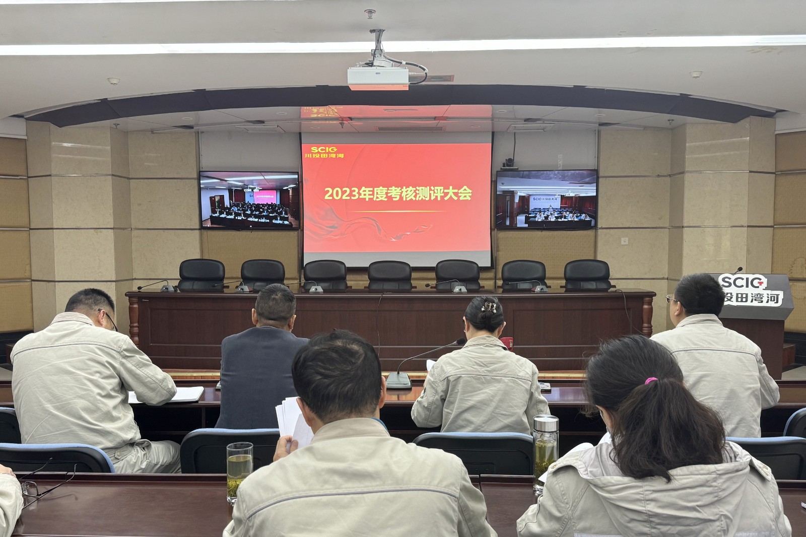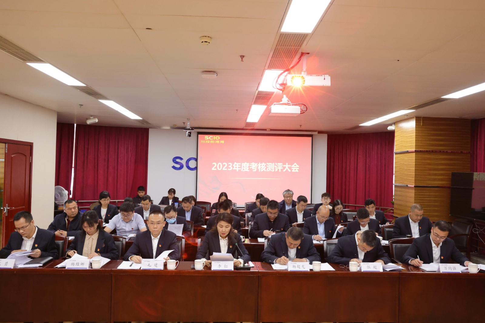 4月7日下午,田湾河公司召开领导班子2023年度述职测评及选人用人“一报告两评议”工作会,会议由公司党委书记、董事长李红主持,领导班子成员、中层管理人员及员工代表共计39人参会。