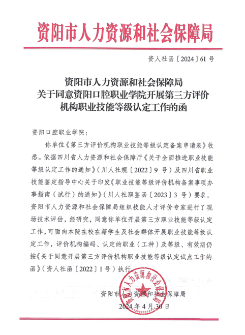 为响应国家职业资格证书制度改革,资阳口腔职业学院紧抓国家职业技能等级认定试点的有利契机,于近日获资阳市人力资源和社会保障局正式批复,获准第三方评价机构资质,可面向社会群体开展职业技能等级认定工作。