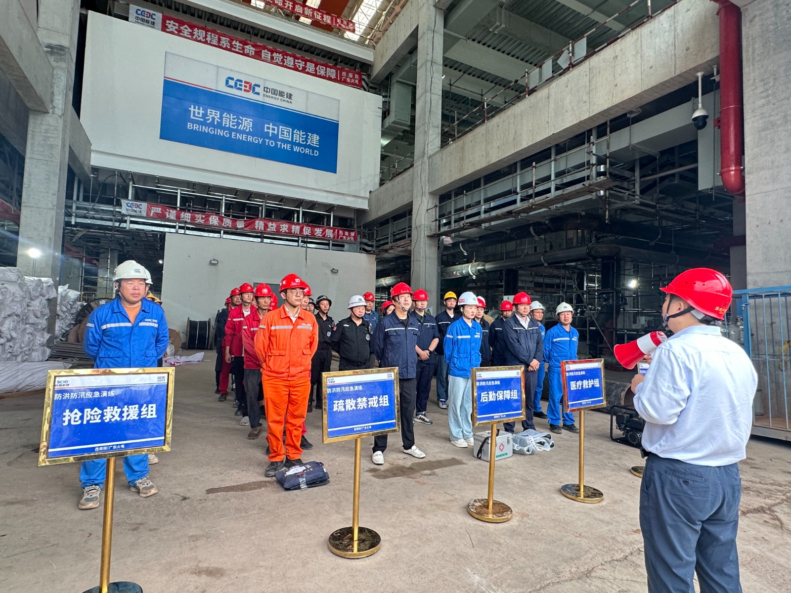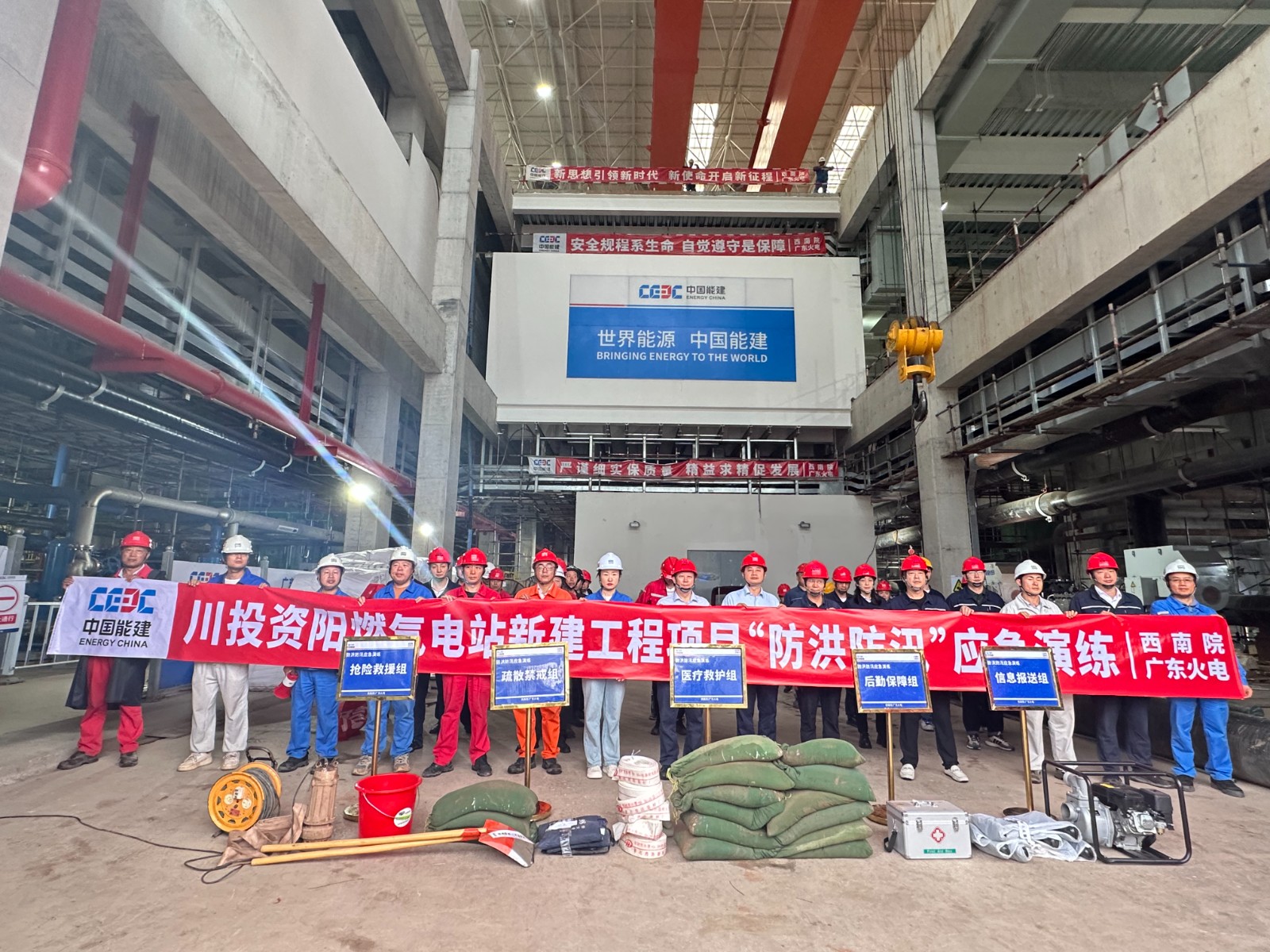 本次演练模拟了暴雨天气下#1机组主厂房0m凝泵坑排水电机故障,雨水倒灌危及设备安全,项目启动应急响应。演练现场,由参建各方组成的应急演练队伍,听从指挥指令、分工有序、密切配合,各环节衔接紧密,应急反应快速到位,有条不紊地完成险情发现汇报、应急响应启动、应急队伍集结、应急抢险等多个环节,真实地模拟了险情应急的全过程,有效检验了应急预案的可行性和可操作性。