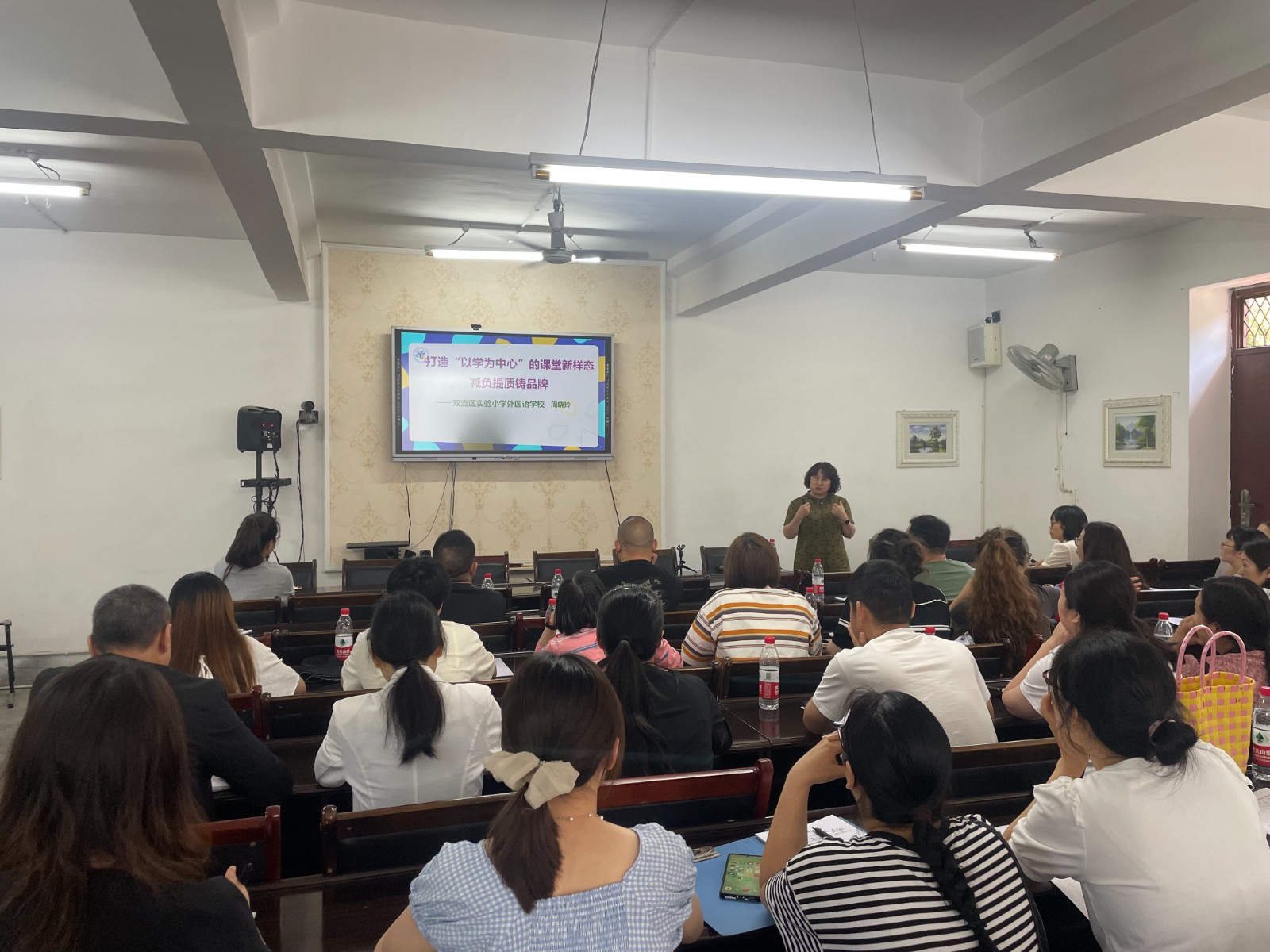 在教室里,来自双流区棠湖小学(南区)的黄佩茜老师为学生带来了一节预习导学课,根据学习步骤引导学生开展自主预习。来自双流区实验小学外国语学校的王甜甜老师通过精讲点拨课,带领学生入情入境地感悟语言文字的魅力。双流区实验小学外国语学校校长、四川省特级教师、双流区名师周晓玲工作室导师周晓玲以《语文课程标准》理念为切入点,围绕四年级下册第八单元《巨人的花园》这篇文章深入浅出地剖析了两种课型的设计理念,带来了工作室关于“自能课堂”的最新研究成果,传播教育新理念。