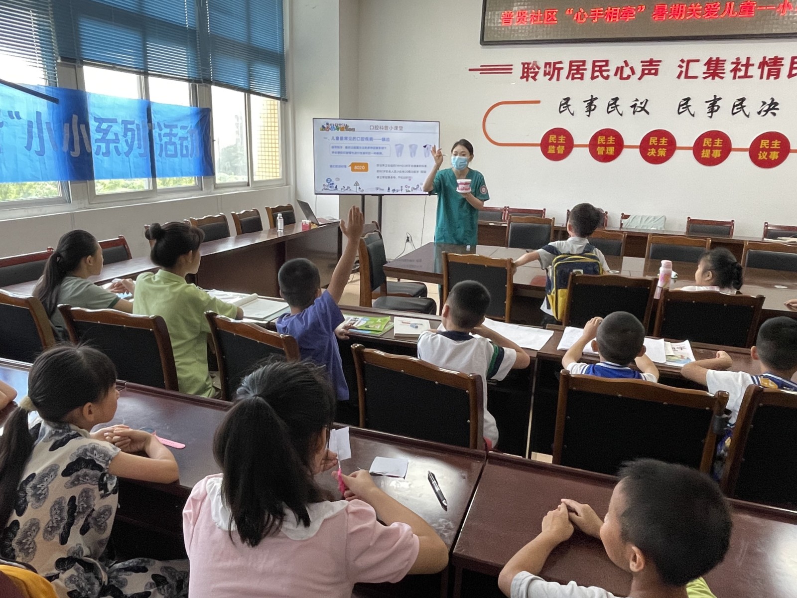 暑期来临,为加强对儿童的关爱,增进亲子关系,同时普遍口腔医院双流门诊部携手普贤社区,邀请28组家庭参加“心手相牵,暑期关爱儿童”小小牙医口腔健康知识科普讲座活动。